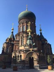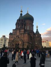 圣索菲亚大教堂在中央大街东边一点,很有年代感,可以喂鸽子,门票不贵,但是要早点去,四点半就不让进了。附近没有什么好吃的地方,对面一个商场,六楼有快餐吃。有拍婚纱照的。里面基本上都是照片。