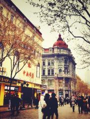 哈尔滨中央大街各种特色的欧式复古风格建筑,长长的石头路!和各种美食!非常不错的地方!非常好,值得一去的地方!情侣溜达溜达