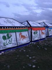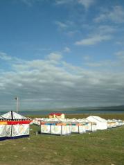 青海湖,位于青海省境内青藏高原的东北部,由祁连山的大通山、日月山和青海南山的断层陷落形成。是中国最大的内陆湖和咸水湖。2016年7月20日下午我们顺着南岸的G109沿湖公路前行,满眼湖光山色左顾流连,景不醉人人自醉。为了在青海湖看日出,问了一家紧靠湖边建的一栋砖瓦结构的平房旅店,老板说一个标间480元。又问了一家环湖路边的帐篷旅店,老板是个江苏人,他告诉我们他在湖边租的这块草地,旺季这3个月租金5万元。他有十几个藏式的蒙古包,每个包通铺能住4人,每个床位要50元。我们又顺沿湖路走了几公里,到了一个叫江西沟的村子,路两边全是二层楼的酒店,吃饭和住宿及停车条件都不错。心里惦记看日出,不到四点就醒了