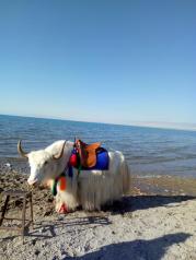 九点游完塔尔寺后驱车前往青海湖,在不到151基地的最后一个牧民自留地进了青海湖边,因为一路过来看到其他牧民到湖边的路都是泥路,这天又一直断断续续下着雨,只有他家是水泥路,比较好开,只是不能完全开到湖边,一人十元,牧民会推荐骑马(伊犁马买来就15万了)拒绝后也没态度不好,和牧民一起还抽烟聊了一会天,他家能看到一个潜艇基地(牧民说的)据说以后到冬天湖面结冰后还能直接开车,准备离开时看到了神牛,^ _ ^