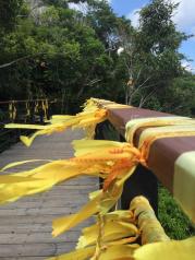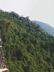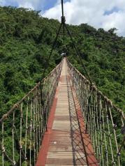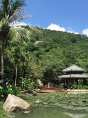亚龙湾热带天堂森林公园真的太美了,建议下次再来的话一定要住在上面,山上的度假屋,建设的别墅外形很有意思,像鸟巢一样,无边的泳池,向下俯瞰景色特别美。 冯小刚拍摄非诚勿扰的取景地,吊桥,站在上面风景也是非常之美。只是没有办法一个人在上面拍照,无论如何人不多的时候也是一个个排队通过。 其实最有意思的在做小巴车的时候,弯弯曲曲的山路,两辆小巴游览车一交错,车上的人就会大喊跟对方打招呼,特别搞笑。