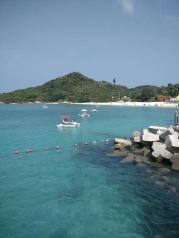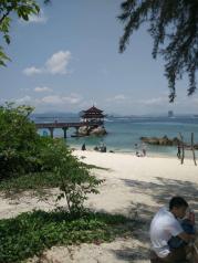 蜈支洲岛因为地点离市区较远,来之前还在犹豫是不是浪费时间,结果到岛上以后就会觉得不虚此行,真可以用鸟语花香来形容,海水比亚龙湾还清澈。我们坐的电瓶车150元的,包含全部景点可以绕岛一周。有些人工的景点看看也罢,印象最深的是三角梅林。但是岛后面不坐电瓶车走不到的地方还是值得一看的,岛靠码头一边是白沙,海水清澈,越往岸边颜色越浅,大海深处到岸边颜色依次是深蓝浅蓝浓绿淡绿直到透明,而且水竟然是静止的,凝固的,象一块巨大的天然的宝石。