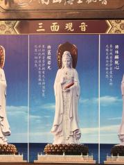 南山海上观音是南山文化旅游区的一个 主要景点,在南海叠立着一尊三面观世音圣像。从各个角度都能见到观世音。从底座乘电梯上四楼再走三层就到达南海观世音脚下,抱抱佛脚,祈求平安。在这个平台还可以观赏四周景色。这里是很值得去的地方。