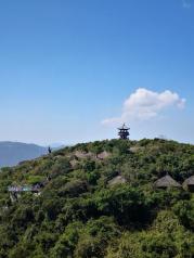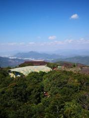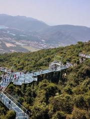 亚龙湾热带天堂森林公园的玻璃栈道虽然很不错,能看但海天景观,但是另外的门票价格有点高,而且人超多。游览车上到山顶后,可以沿着斜坡上到一座塔楼,高三层,可以眺望到亚龙湾全景,景色非常美丽。
