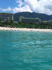 亚龙湾距离市中心区约10公里,为一个月牙型,海水还可以吧,不是特别的蓝,蜈支洲更好一些。海滩上感觉比较乱,沙滩边的公用厕所要收费,也不怎么干净。那边的高级酒店还不少。