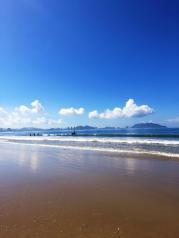 大东海是免费景区,三面环山,一面朝向大海,阳光沙滩,蓝天白云,碧海青山,翠绿椰林,洁白沙滩,还可以游泳。距离市中心很近,交通很便利,吃住都挺方便的,游人也多,看完美景就打车前往第一市场吃海鲜,非常方便。值得一来!