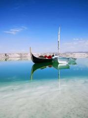 茶卡盐湖——天空之镜,果然名不虚传,我们去的时候刚从阴天转多云,湖面也能倒影出蓝天白云,一艘小船停在那,完整的湖中倒影恍如仙境,可想而知阳光明媚的时候应该更是美得令人窒息。不过可别幻想着像抖音一样在湖里起舞弄清影,镜头翻转呈现出来的惊艳,因为有的地方水深了,穿的鞋套不够长,好像还漏气水。袜子和裤子都是满满的盐巴,可真尴尬。水深的岸台其实应该封住的,可见工作人员管理不善。白花花的盐路有如雪地的感觉,配上鲜艳的小火车,别有一番风味。建议避开暑假、节假日等,人少的时候来可以慢慢品味,还有就是得看天公作美否,高原上可是说变就变了