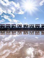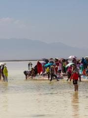 茶卡盐湖是青海可以与青海湖相媲美的景观。这里的人气很旺。景区交通管理理念。先进。有观景小火车直达景区最远端-查卡盐湖湖心码头和码头火车站,也可乘坐摆渡车到天空之镜站,再慢慢向湖心方向步行赏景。游览亮点有天空之镜广场、盐雕、镜面造型、盐山观景台和进入湖心嬉戏等。