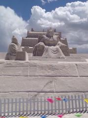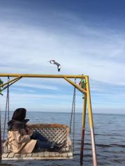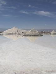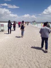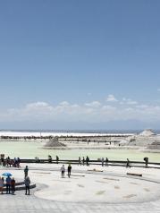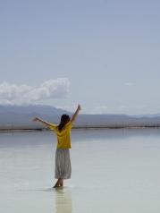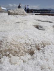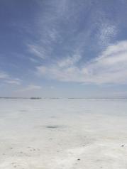 进入茶卡盐湖景区,映入我眼帘的是小火车,我们坐着小火车看到周围铺满了洁白的盐结晶,旁边还有巨大的盐山堆积,远处的湖面上洁白洁白的,不知道的人还以为是白茫茫的雪地呢?不一会儿我们来到了一个盐山,用盐堆起来的,我坐在一个巨大的盆子里就往下滑,听导游讲冬天它就是一个滑雪场。这里没有江南格调的小桥流水,也没有城市的喧闹,它很安静也很美,有一种海天相接的感觉,我们下了小火车,走在铺满盐的路上,犹如进入盐的世界,导游说还有一个可以游泳的地方,我惊奇坏了,也兴奋极了,迫不及待跳到湖水中,湖水很浅,但是漫过了我的膝盖,湖水很咸,这就是神奇的漂浮,因为盐湖的湖水中有很大的浮力,,人在水中不会沉下去,而是会轻轻松
