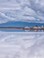茶卡盐湖也叫茶卡或達布遜淖爾,“茶卡”是藏語,意即鹽池,也就是青海的鹽;“達布遜淖爾”是蒙古語,也是鹽湖之意。茶卡鹽湖位於青海省海西蒙古族藏族自治州烏蘭縣茶卡鎮附近,湖面海拔3059米,與青海湖相隔,總面積達105平方公里。茶卡鹽湖處於柴達木盆地之中,其形成是由於地殼運動。青藏高原從前是海洋的一部分,在長期的地殼運動中,地面抬起,變成了世界上最大的高原,而海水則留在了一些低漥地帶,從而形成了許多鹽池和池塘,茶卡鹽湖就是其中之一。茶卡鹽湖中的鹽幾乎無窮無盡,因為雨水會將更多的鹽從周圍的山上沖進湖中,使其取之不盡,用之不竭。與其他鹽湖不同的是,茶卡鹽湖是固體和液體並存的滷水湖,鑲嵌在雪山草地間而非