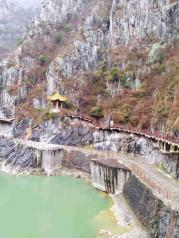 走一走悬崖峭壁上的石门古栈道,体验和感悟下古人的智慧与艰辛。 由于东门暂时关闭,只能从西门进景区。车停在西门口,步行好长才能游客中心。扫码直接进景区,可乘小火车(2公里路程)至大坝处,爬大坝,攀栈道,这才是主景区。若是有体力,可以选择步行,沿途是一些人造的石像,走走情人桥,风景也不错。 由于我们时间紧,再加上走不动,步行至大坝处没有再向上了,不过想必从上往下看的风景,一定是壮观且难忘的。