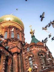 哈尔滨中央大街俄式风格的建筑群整齐地排列在大街的两侧,有很多卖俄式商品和哈尔滨特色的商店。沿着街道一直走,会走到松花江畔,风景很好。