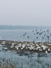 冬季来天鹅湖国家城市湿地公园看天鹅,数量真的很多。而且在大坝上看距离也很近,好多摄影爱好者在拍摄。游客们也都很自觉,不乱丢弃垃圾,不大声喧哗,很不错。就是静静看着天鹅起起落落,沿湖散散步就很开心。可惜来的两天天气不给力,一直阴天有云雾,如果赶上蓝天肯定很好看!听说每天早上8:30-9:00在大坝湖滩会有工作人员给天鹅投喂食物,会非常壮观,我起晚啦没赶上,有兴趣的盆友们可以提前去守着看哈哈。另外湖边稍一有风就蛮冷的,大家做好保暖工作~还有,天鹅中有两只黑天鹅,我去的两天他们都在大坝这边躲着,来的朋友可以留心找找