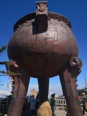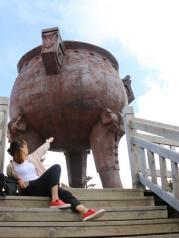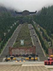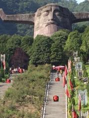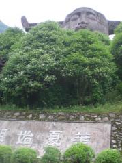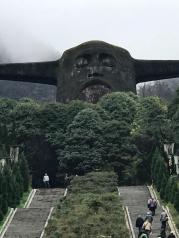 来到神农架的第三天,驱车前往神农祭坛。在蒙蒙的细雨中迈过343级台阶登上了神农坛。神农祭坛的主体建筑是神农巨型牛首人身雕像。高21米,宽35米,相加为56米,以示中华56个民族紧密团结,欣欣向荣。雕像立于苍翠群山之间,以大地为身驱,双目微闭,洞察秋毫,似在思索宇宙。五色石分别为五行学说中的金,木,水,火,土。近处,高10米的图腾柱分别立于祭坛的左右两边,柱上的大小牛首以示神农氏为牛首人身,子孙后代繁衍之意。图腾柱的前方有两幅大型浮雕,展现了神农氏一生的丰功伟绩。