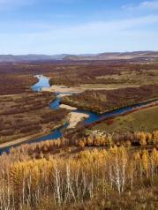 根河湿地蜿蜒清澈的根河静静流淌,赋予大地生命和灵魂;草甸树木环抱其间,一片金黄。或许在九月中旬到来能看到更加绚丽的色彩,不过眼前的景象已经足以让我们着迷。