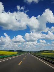 呼伦贝尔,蓝蓝的天空, 白云, 绿草地, 牛群羊群,自由自在, 油菜花,初初开放, 撒欢的孩子, 最美的风景在路上, 身心舒畅。