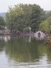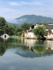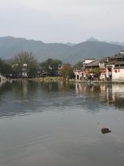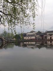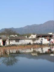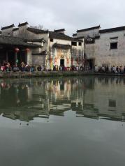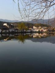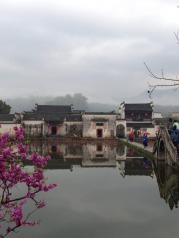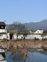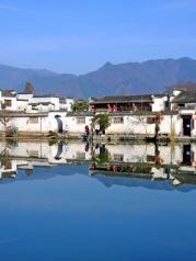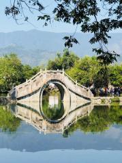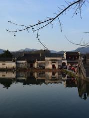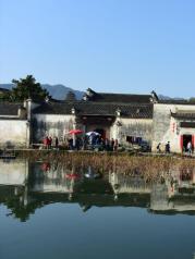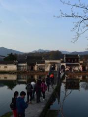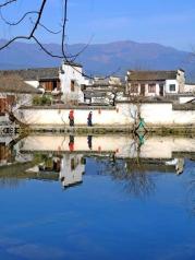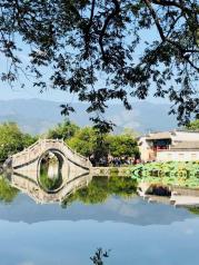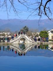 这里就是有“黄山脚下小西湖”之称的南湖。此名来源于清嘉庆甲戊年秋,浙江钱塘名士吴锡麟游南湖后,撰文述道:“宏村南湖游迹之盛堪比浙江西湖”。 南湖上有一石拱小桥,人们从桥上依次通过,身影倒映在湖水中,构成了一幅绝美的风景画。 有诗赞曰:“无边细雨湿春泥,隔雾时闻小鸟啼;杨柳含颦桃带笑,一边吟过画桥西”。现在虽然是冬季,没有细雨鲜花,但景色依旧美丽。