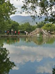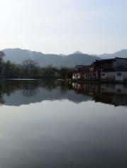 宏村整个形状似一牛形,而南湖就是这牛形的一个牛胃,据说这南湖也是效仿了杭州西湖的“平湖秋月”。进入景区的第一眼,就可见南湖,那画桥、白墙墨瓦和清澈的水面,构成了一幅名副其实的水墨丹青,秀美怡人,真如一幅中国画卷,令游客对宏村充满了期待。