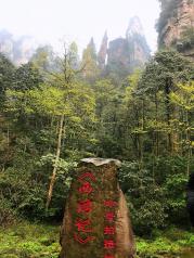 充分利用四日门票,可以分别从武陵源景区和张家界景区,两处正门进入。携程订票的取票点这两处也都很容易找得到。张家界风景区进入途径金鞭溪,沿途有不少大腕题词,我留意了金庸大侠的。走两三百米吧就可以来到黄石寨脚下,现在后山山路在修建,徒步上下都只有前山山路可以走。垂直海拔九百米左右,台阶路挺好走,苔藓植物基本没有。