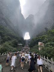 天门山玻璃栈道观景台山上看景天门洞999节台阶,可以选择坐电梯,我们大部分人都是走下来的,还好。早上不到八点坐缆车进天门山景区,先走西线后到东线,然后汽车下山,走99个弯的盘山路,回到驻地大约两点多。中间十二点左右在下山自动扶梯处休息,一圈游览时间4-5小时左右。