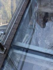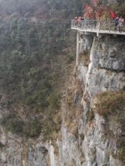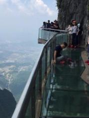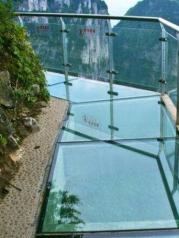 天门山玻璃栈道是天门山国家森林公园天门山顶游览线路西线中的一段。悬在天门山顶崖壁上的栈道中,有大约60米是由玻璃搭建的,胆小的人走在上面腿可能会软。在上玻璃栈道前,游人会被要求穿上鞋套,以免鞋子直接踩上去把玻璃踩花。但由于天门山雾气很大,使得玻璃不那么透明,加上山崖壁上伸出树枝等,遮挡了玻璃下面的深渊,所以走在上面没有什么感觉。