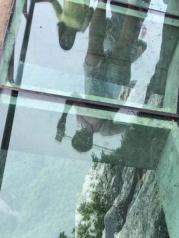 天门山景区有东线和西线两段,两段都分别有玻璃栈道(鞋套需要分段租)。早上东线较晒,下午西线较晒,阳光充足当然拍照也好看,就看个人喜好选择先走哪边了。 走东线玻璃栈道的时候,遇见一畏高男,后来看照片才发现他女朋友和友人就在旁白欢乐拍照。 玻璃栈道其实只要不专注往下看也不可怕,一直往下看,真有点晕。