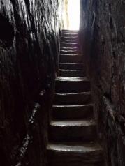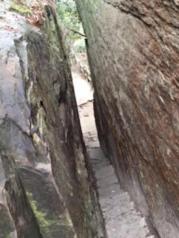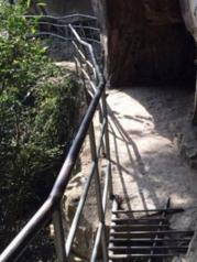 由“乌龙寨”的寨门往上是颇陡的坡,几十米外有一临崖平台,两三条枪架着,易守难攻。几米外是乌龙寨的第一道鬼门关“一步难行”。小路一个急弯向右,一块岩石兀然突出,人必须紧贴着岩壁,慢慢转过去,一不小心,就会坠入山崖,只要派一个人持刀守候,再多的人也不在话下。 继续前进的路,悄然间已不那么分明,钻洞绕石,似路非路,几米外便难见人,百余米的路,艰难曲折,人需要弯腰才能上行。第二道鬼门关“谁能不低头”便挡道于此。近百米的陡坡几近直立,石路从两块巨石间穿过,人须侧身才能慢慢上行,一夫当关,万夫莫开。“一夫关”是第三道鬼门关。乌龙寨能立足多年,并非徒有虚名。 这里只能用“钻”的......一步难行险峻的道路