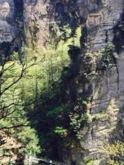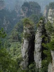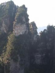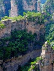 乌龙寨四面皆为断壁深崖,不远处还有一座孤峰和乌龙寨所在的山峰相伴相依,这上面可以看到袁家界的奇景天波府。再费一番周折,攀上天波府绝壁山顶,四周景色尽收眼底。这里的峰墙景观和天然长城完全不同,更像是残桓断壁。 绝壁峰墙交缠错落,参差不齐,场面悲壮,令人不由感叹大自然的威力及沧海桑田的变幻。相传此乃杨家“天波府”的遗址,杨家将后代的一支曾经流落到此,因此这里不少景物的名称都与杨家将有着不解之缘。乌龙寨下来不走回头路,因为上来的路实在太过凶险,单行都非常困难,别说双行了,所以新修了一条环形栈道。这条路就好走多了,还可以看到快活林、猴王拖队和一统江山等几个景点,不过由于太过抽象,我们傻傻分不清楚。