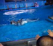 老虎滩海洋公园极地馆海豚表演不错,一个海豚尾巴拍球选幸运观众环节海豚把球派到天棚铁栏杆夹住了,全场哄堂大笑