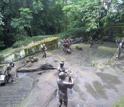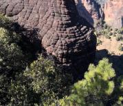 我们自驾到钓鱼城。在山上,因为天阴所以景色看不清楚,但是隐约中看得出天气透明度好的时候这里是很壮观。里面参观的内容很多,有:石照县衙,护国寺,护国门,古军营等。其中有块大石头在护国门这边,在这里拍照,后面有树远处是山谷,景色很美喔。这里有段著名的战争历史,南宋抗蒙时候有过惨烈的战争,这里牢固的山城防御体系成功挡住了蒙军的进攻。