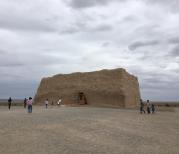从古至今,玉门关的诗词流传甚广,而去了敦煌,怎能不去玉门关。玉门关遗址位于甘肃省敦煌市城西北80公里的戈壁滩上,一名小方盘城,是长城西端重要关口。相传著名的“和田玉”经此输入中原,因而得名。它是古代“丝绸之路”北路必经的关隘。现存的城垣完整,总体呈方形,东西长24 米,南北宽26.4米,残垣高9.7米,全为黄胶土筑成,面积633平方米,西墙、北墙各开一门,城北坡下有东西大车道,是历史上中原和西域诸国来往及邮驿之路。北望长城,犹如龙游瀚海。俯仰关外,大地苍茫,人迹罕至,故唐代诗人王之涣有“春风不度玉门关”之句。 而我们抵达玉门关的当天,狂风大作,风卷着沙吹在脸上生疼,并更显得茫茫戈壁滩上玉门