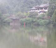 走过上山的栈道,到达月城湖,由此可前往索道、上清宫。月城湖群山环绕叠嶂,林木茂密葱翠,给人以幽深清静之感,湖中矗立一石碑,上书月城湖,在乘船处有一观景台,可观月城湖景色。