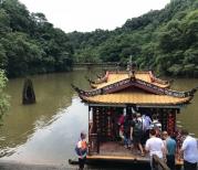 月城湖湖不大,湖上有摆渡船,一个人5块,15分钟一班。船上没有控制室,很好奇怎么开的,后来才发现两头有钢索拉着过湖的。走路绕过去大概不到10分钟吧,大船坐3分钟,导游说这儿是青城山风水最好的地方