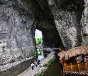 这个景区是完全根据陶渊明的《桃花源记》而打造的景区,游客从正面进入,经过一个长达3公里的地下溶洞,最后进入桃花源,工作人员和游客都可以穿秦服,有一种穿越回秦朝的感觉。里面的建筑和人,都是先秦时期的装扮。