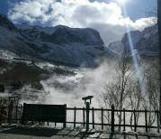 长白山天池北坡是最早开发的区域,成熟的景区,但是这里最主要的景区天池确是要靠运气的,一年365天,有250多天是看不到的。 山下天气晴朗,到了山上却是主峰关闭,因为下雪关闭了。那么就去了北坡的其他几个景点,瀑布,小天池,森林。 山上因为有雪很滑,漫步上去看瀑布,旁边的沟里流淌着温泉,烟雾缭绕,还有硫磺的味道。看到这个情景就像日本的侦探片里的场景。阳光灿烂照耀着眼睛都睁不开。 小天池叫银环湖,就是一个小水塘,这里拍过电视剧 地下森林在平面上看不出,是低于地坪的,导游说需要在飞机上才可以清晰看到它的不同之处。 么看到天池,期待下次再来。