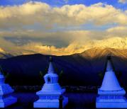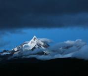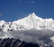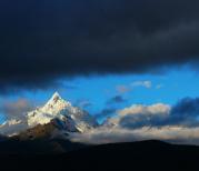梅里雪山,太子雪山主峰卡瓦格博,藏语“白色雪山”之意,俗称“雪山之神”。传说原是九头十八臂的凶恶煞神,后被莲花生大师教化,受居士戒,皈依佛门,做了千佛之子领乃制敌宝珠雄师大王格萨尔麾下一员神将,从此统领边地,福荫雪域。卡瓦格博神像常常被供奉在神坛之上,他身骑白马,手持长剑,威风凛凛,俨然一位保护神。