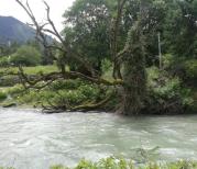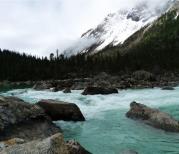 帕隆藏布的江面很宽,两岸植被极为丰富,待层林尽染的深秋,此处一定美极了。山涧的溪水水量充沛,直接冲刷着路面汇入帕隆藏布。帕隆藏布流经的河谷灌木和冷杉丛生,秋分将至,长的着急的叶子已经憋黄了。快至然乌湖段,这一段的高山特别多,因此随着山顶融雪溪流的汇入,帕隆藏布河道变为宽阔。