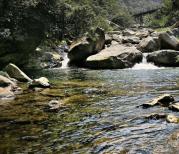庐山三叠泉是突如其来进入你的眼前,没有一丁点前奏,从高及云端的山顶,猛然下落,撞到半山的巨石,轰然一声,震耳欲聋,溅水成雾,然后又撞到第二道石峰,轰轰烈烈,一泄而下,接近下面的水潭时,发现瀑布消失了,只留下一汪清泉。