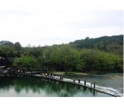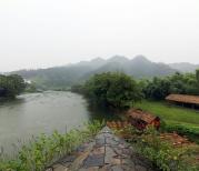 到达彩虹桥的时候正值夕阳西下,一切显的是这么的宁静和美好。这里并不只是一座桥,而是一幅天然的风景画。建于南宋年间140米长的桥,巍然的跨在碧绿的河面上。她并没有精致的修饰,而是简简单单,石头木质,甚至都没什么雕琢,也许正符合了最原始的才是最美丽的。河岸两边绿树成荫,穿过桥走到河边,离桥五十米处有一排石墩,它将上游水面变得异常的平静,而呼啸疯狂的冲向下游,水中树木林立,有一些浅滩又阻止了水流。站在河边一下觉得自己很渺小,被眼前的风景所震撼,也被古人的智慧所感动。言语无法形容,唯有身临其境!
