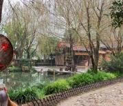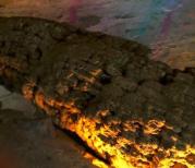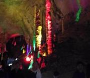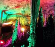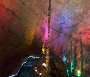 从大门口到黄龙洞洞口还有好长的路。路上亭台楼阁,还有一长串的连环水车是看点,但其实风景不足一提,不如直接把大门造到洞口,我又想当然了。到洞口要排队,限制每次进入的人数,由景点导游统一带入。进洞后,你会发现就像完全进入了另外一个世界,有种“地下龙宫”的感觉。蜿蜒曲折的道路绕来绕去,来到洞里的一池水边,要坐船游览一段。好多人坐在一艘船上,在狭隘的岩洞下的溪水上漂流,有点盗墓笔记或是大漠苍狼里描述的感觉,非常逼真。船边黑漆漆的溪水,不见底的神秘,就怕像故事里突然会有不明的水中生物蹿上来把我们拖下去。下了船继续是上上下下蜿蜒曲折的楼梯,沿着洞内峭壁来来回回的路,真有种盗墓和大漠的感觉。空气冷飕飕,