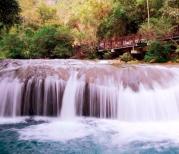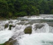 小七孔景区由于地形的起伏,从高到低时而平缓,时而倾斜,形成了六十八级跌水瀑布。 层层叠叠的六十八级瀑布,哗哗喧喧倾泻而下,似银河泻地,形态各异,气象万千。千姿百态的瀑布跌水竞领风骚,争奇斗艳,构成风情万种的动态水景,每到一段都有不同的景色,时而河水变的汹涌澎湃,时而变的细腻优雅。六十八级,很好的形容了跌水瀑布。