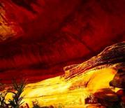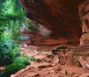 红石野谷以红色蜂窝状的丹霞壁画石刻长廊为特色景观,那如佛、如蛙、如鹿等各种奇形怪状、千姿百态的红石与桫椤,茂密的竹林、 清澈见底的溪泉瀑布,仿佛把人带到了原始、自然、幽静的侏椤纪时代。