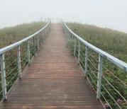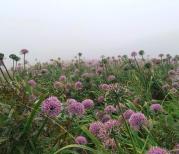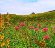 大韭菜坪景区里也有住宿,但也在山下,离景区外的住宿隔着一道大门,没有太大意思,上到山顶还需乘座观光车。观光车单边25,缆车单边40。清晨的韭菜坪气温只有18度左右,需要穿较厚的外套。观光车下来还需爬20多分钟的台阶,然后左转可以很快到玻璃栈道,右转顺着木栈道往前走可以观日出。当天的云层有点厚,直到天色发白也没有看到日出,略感失望。贵州有大小2个韭菜坪,相距不远,其中小韭菜坪是贵州第一高峰,花没这边多,在六盘水境内,大韭菜坪为贵州第二高峰,在赫章境内,有连片10万亩野生韭菜花。摘下一片韭菜叶闻之,果然和我们吃的韭菜味道一模一样,网上说这叶子不能吃,当地人说可以吃,就是有些老。但野生韭菜花花朵可比