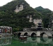 祝圣桥始建于明朝洪武年间,名舞溪桥。祝圣桥上第三孔第四孔之间,建有三层穿斗式,三重檐,八角攒尖,青筒瓦顶阁楼,名称“魁星阁”,又称“状元楼”。祝圣桥是 镇远 古城的标志性建筑,当地人称之为老大桥。