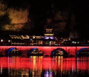 祝圣桥上的灯光在不停地变换着颜色,一会蓝一会绿,接着又紫了……河面上,几艘小游船静静地飘浮在水面,四周静悄悄的。