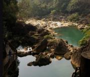 小七孔的水非常有特点,碧绿如翡翠、瓦蓝似宝石,既有九寨的澄澈多姿,也有泸沽的温婉如玉。难能可贵的是,小七孔的水不会拒人于千里之外,而是可参与可互动的,就是说,你完全可以和家人一道,踩水、划船、水仗,尽享天伦之乐。有意思的是,尽管景区外的河水浑浊不堪,但一进入景区,便如换了一副心情和妆扮,以清新脱俗的外表迎接我们的到来,这种内外天壤之别,个中缘由值得推究。 从小七孔桥上向对面望去,翠竹掩映中又一座石桥寂然挺立,和小七孔相映成趣。景区内有一条旅游公路贯穿始终,观光车会在每个景点停靠。游人从景点的一头开始游览,结束后在另一头的站点乘车,如此循环往复。从东门进入,整个行程是逆流而上的。小七孔