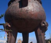 来到神农架的第三天,驱车前往神农祭坛。在蒙蒙的细雨中迈过343级台阶登上了神农坛。神农祭坛的主体建筑是神农巨型牛首人身雕像。高21米,宽35米,相加为56米,以示中华56个民族紧密团结,欣欣向荣。雕像立于苍翠群山之间,以大地为身驱,双目微闭,洞察秋毫,似在思索宇宙。五色石分别为五行学说中的金,木,水,火,土。近处,高10米的图腾柱分别立于祭坛的左右两边,柱上的大小牛首以示神农氏为牛首人身,子孙后代繁衍之意。图腾柱的前方有两幅大型浮雕,展现了神农氏一生的丰功伟绩。
