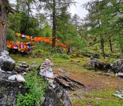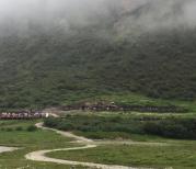 洛绒牛场是附近村民放牧的高山牧场,成群的牛羊在这里享受着充足的阳光、青青的草地和纯净的湖水。这里被“日松贡布”三座神山环绕,贡嘎河从草场穿梭,林间溪流潺潺,与牧场木屋交相辉映,构成了一幅原始而又迷人的景色,令人们进入返朴归真的境界。