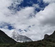 走小徒步时坐景区大巴到扎灌崩下车就看到了金碧辉煌的冲古寺,后面是品字型的三座神山,但天晴时也只能看到两个,我们去时有小雨,云把神山完美遮挡,只能脑补了。