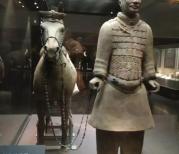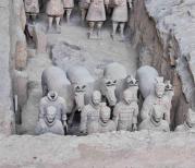 秦兵马俑博物馆是由位于陵园东处发现的从葬兵马俑坑三处组成的博物馆,成品字形排列,面积达2万平方米以上,出土陶俑8000件、战车百乘以及数万件实物兵器等文物。 当你置身俑坑的时候,才会切身感受到那份震撼,满目的兵马俑,清一色的单眼皮,细看每一位的表情都有些许变化,一号坑为“右军”,埋葬着一比一真人大小的陶俑;二号坑为“左军”,是一个由步兵、骑兵、战车等三个兵种混合编组的曲阵,也是秦俑坑的精华所在;三号坑是统帅地下大军的指挥部,很多残垣断壁。这整个军阵是秦国军队编组的缩影,仿佛将当年的面貌完整的体现在我们眼前~ 图七八九是镇馆之宝——跪射俑,身穿战袍,外批铠甲,头顶左侧绾一发髻,左腿曲蹲,右膝着地